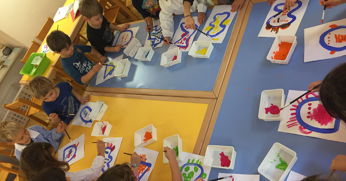 Siamo partiti da una riflessione generale su cosa sia un diritto e un bambino e tutto il gruppo è rimasto colpito dall’idea che un bambino è “una persona piccola che ha però pensieri grandi” (dal libro “Che cos’è un bambino” di Beatrice Alemagna). Nei giorni successivi ci siamo soffermati sul diritto alla noia (pensiamo ad una stanza vuota e diamo spazio all’immaginazione…cosa succede?), al movimento, alla diversità e uguaglianza (una serie di interessanti riflessioni sono scaturite dalla visione della serie di fotografie “Bambini del mondo” di Steve McCurry a cui ha fatto seguito la rappresentazione grafica del ritratto dell’amico) e all’espressione (tradotto, nella pratica, con il laboratorio grafico pittorico di Tullet).