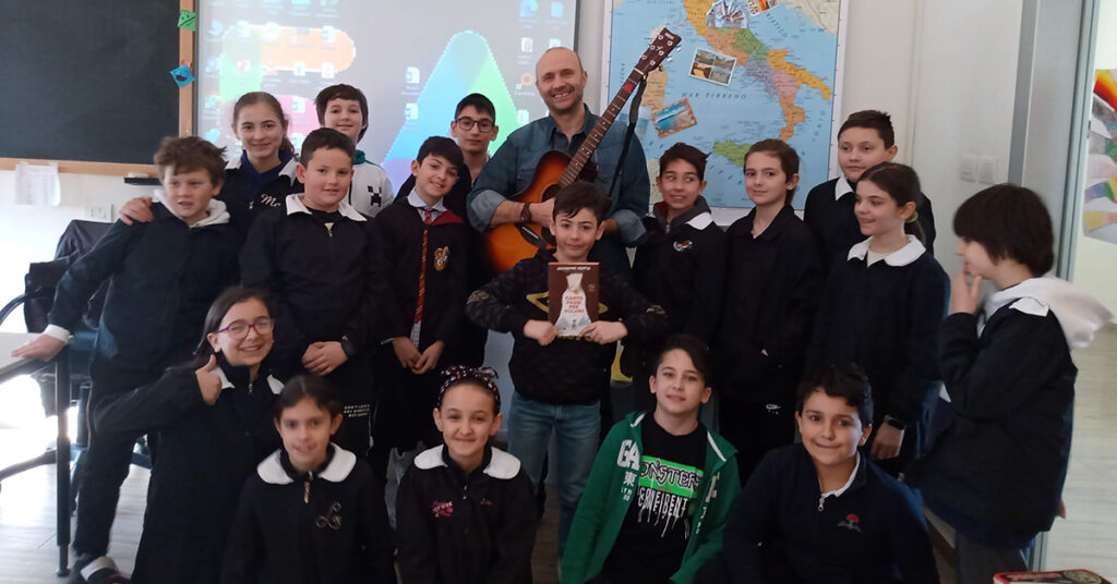 Ha raccontato di non essere stato un appassionato lettore da bambino fino a quando, l’ultimo giorno di quinta elementare, la sua maestra Patrizia gli regala un libro che gli cambierà la vita. Da lì nasce la passione per la scrittura. I ragazzi sono stati colpiti dai suoi racconti sull’orsa Yoga, sull’orsetta Morena, sulle avventure vissute durante i turni di volontariato nel Parco Nazionale d’Abruzzo. Musicista e fondatore del gruppo Lingalad è riuscito a far sentire il profumo dei boschi, il soffio del vento attraverso la sua chitarra e la sua voce. Ha raccontato di aver conosciuto personalmente il protagonista del libro che la classe sta leggendo: